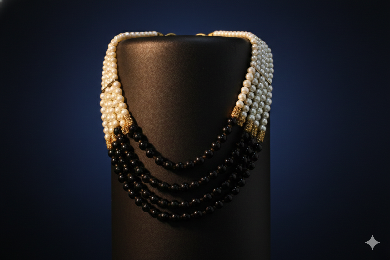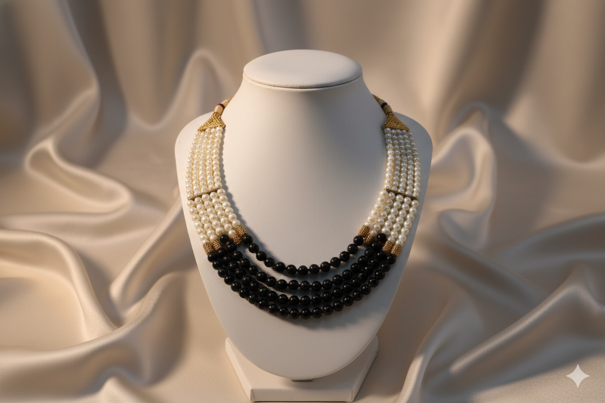 A sophisticated multi-strand necklace featuring radiant white pearls forming the upper section, complemented by a striking drop of deep black beads, all set against a backdrop of flowing champagne satin.